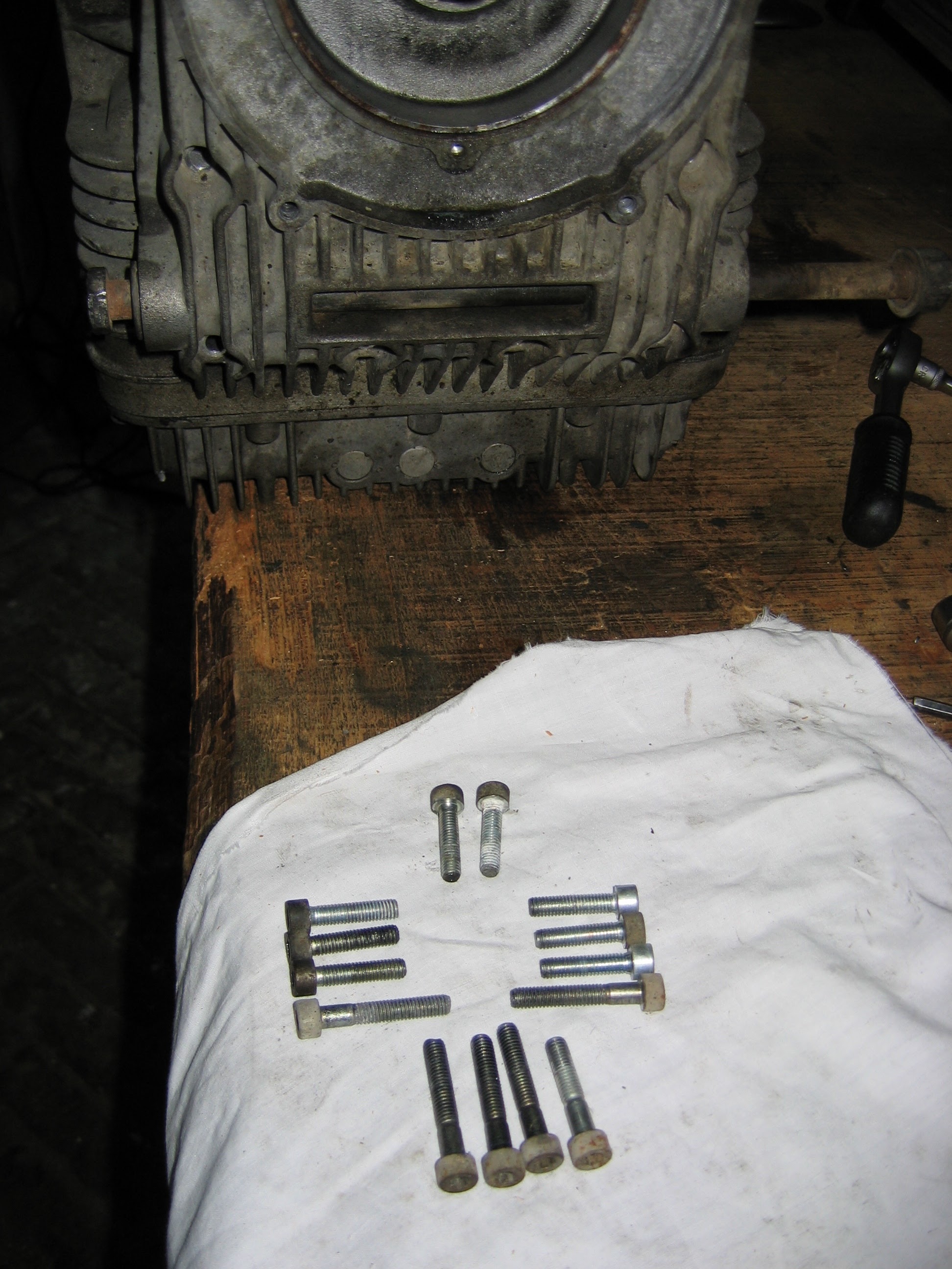 ![]() Puis on glisse une pige de pression (à droite sur la photo suivante) dans le trou du rotor, et on resserre avec une vis de TRES bonne qualité. La pression de la vis sur la pige décolle le rotor du cône du vilebrequin. Attention à prendre des éléments de bonne qualité, par exemple la BTR en qualité 12.9 à droite sur la photo. L'outil ad-hoc vendu par SiebenRock (deuxième en partant de la gauche, du bête acier 8.8 à 5.25€ !), les vis de rotor d'origine (en haut), et même la pige ultra-solide de Roland se sont tordues sous la pression à appliquer.