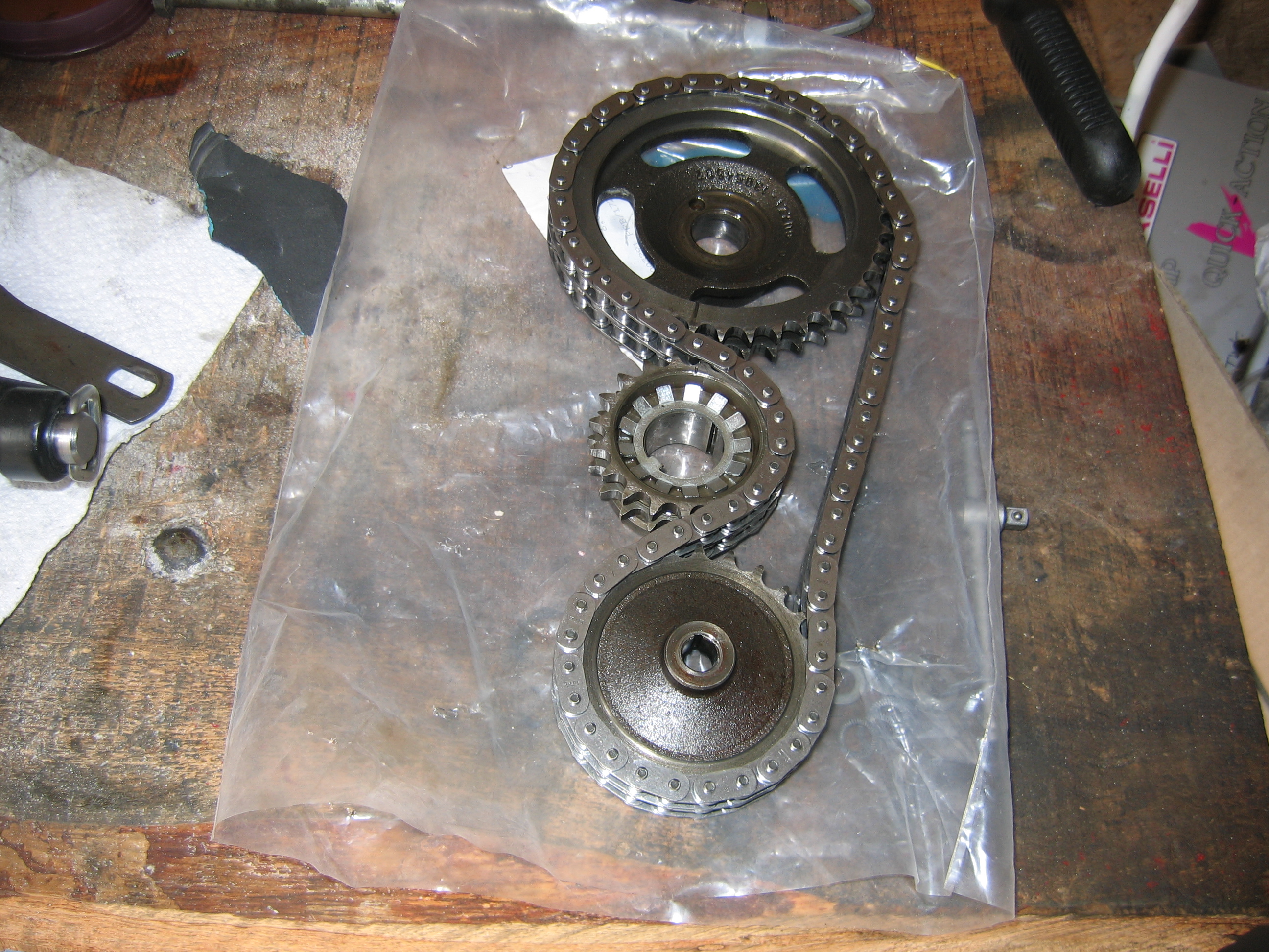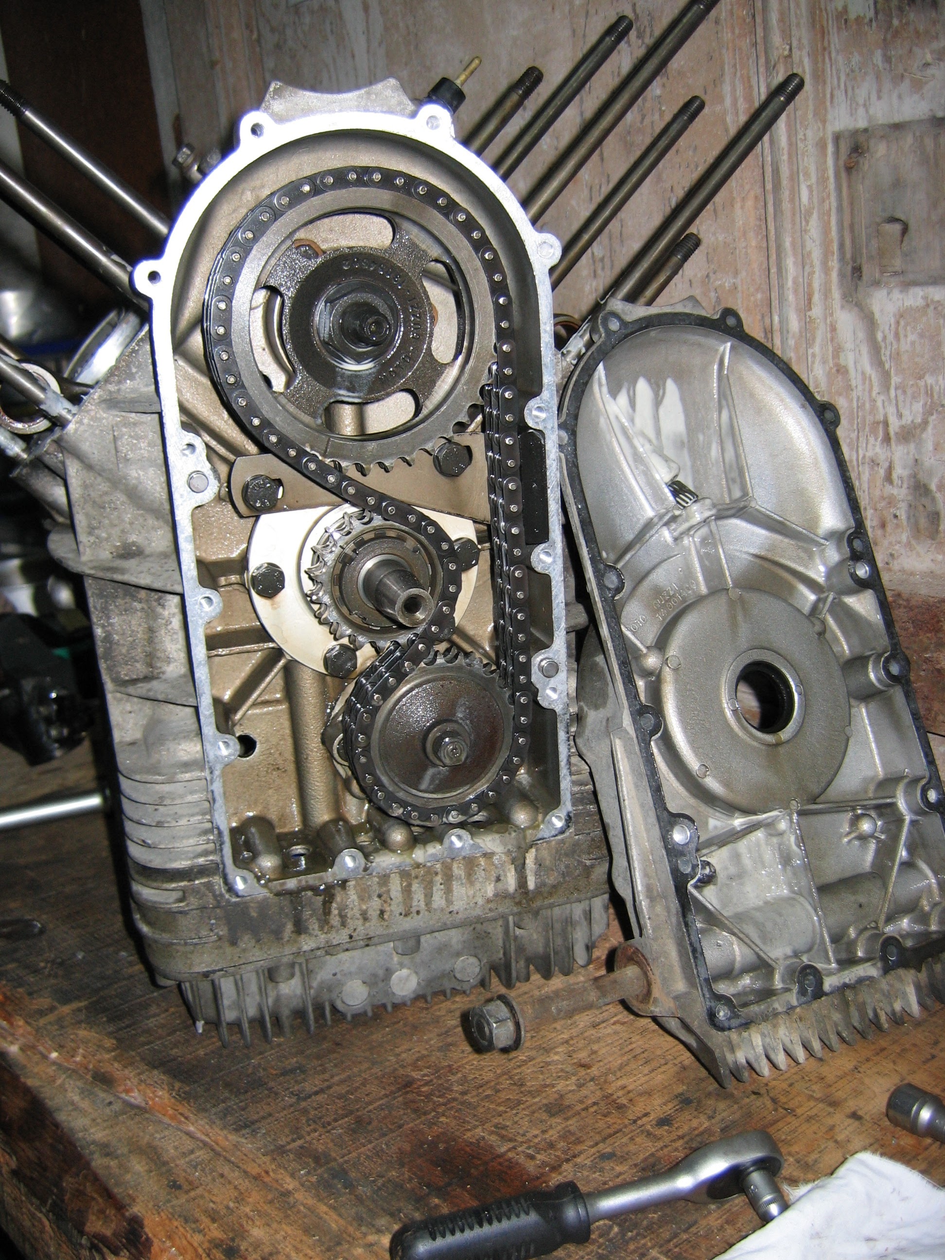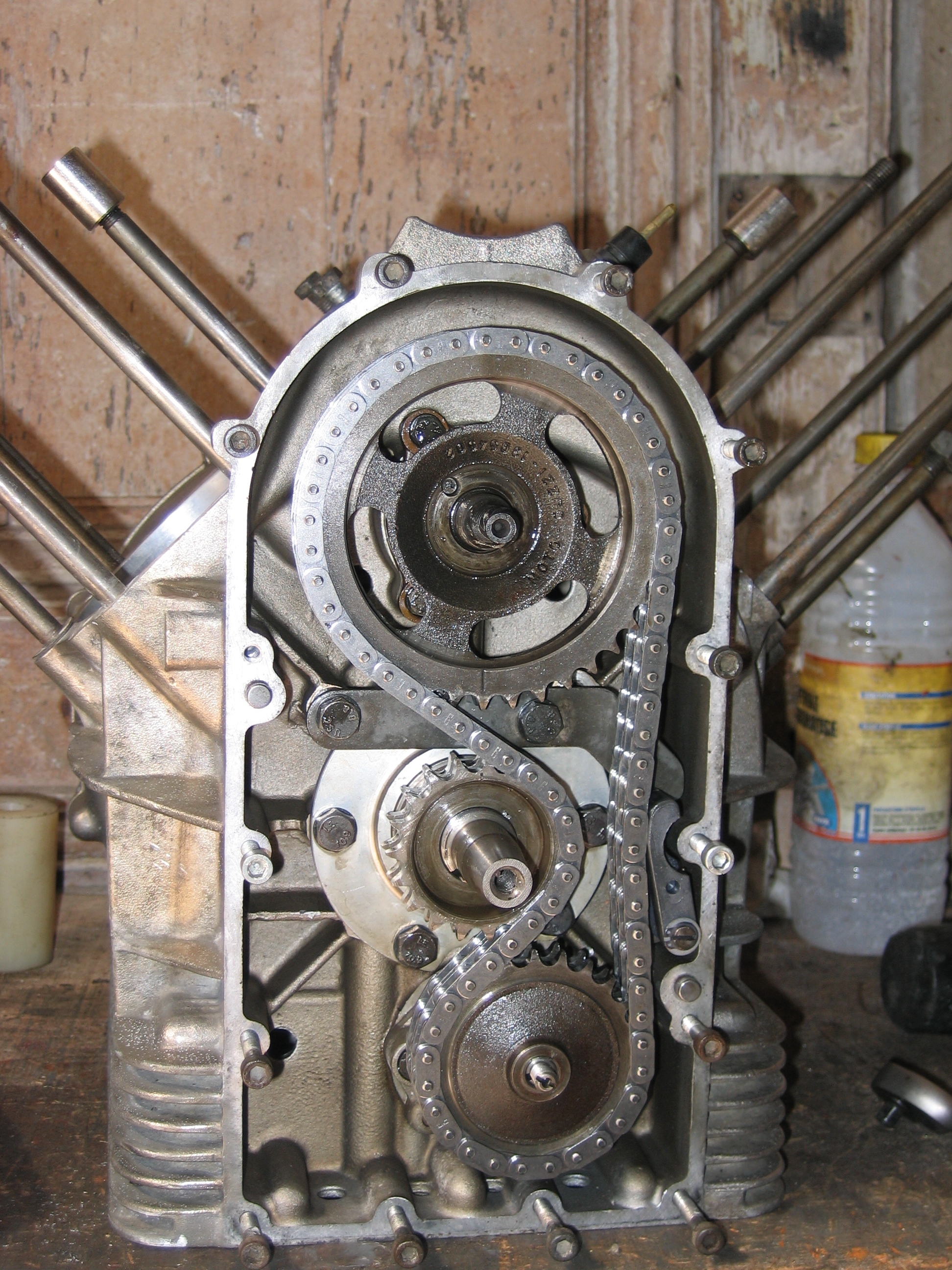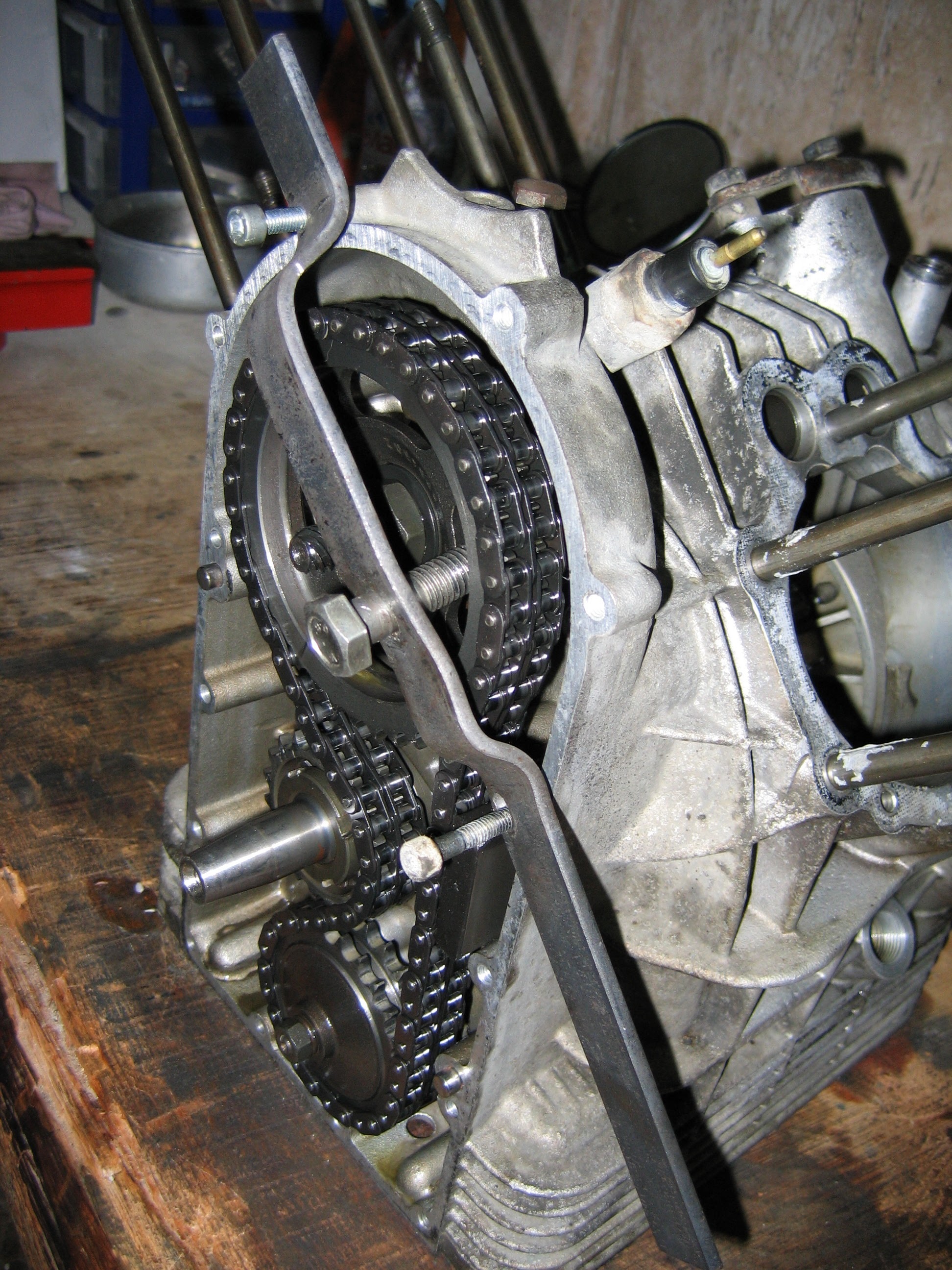 On remonte la chaîne de distribution, avec un nouveau tendeur avec ressort, qui marchera mieux. La pose de la chaîne est fastidieuse, avec les trois ergots des pignons qui doivent être en face de ceux des axes, et les deux traits des pignons AàC et vilo alignés. C'est sûrement beaucoup plus facile à deux.