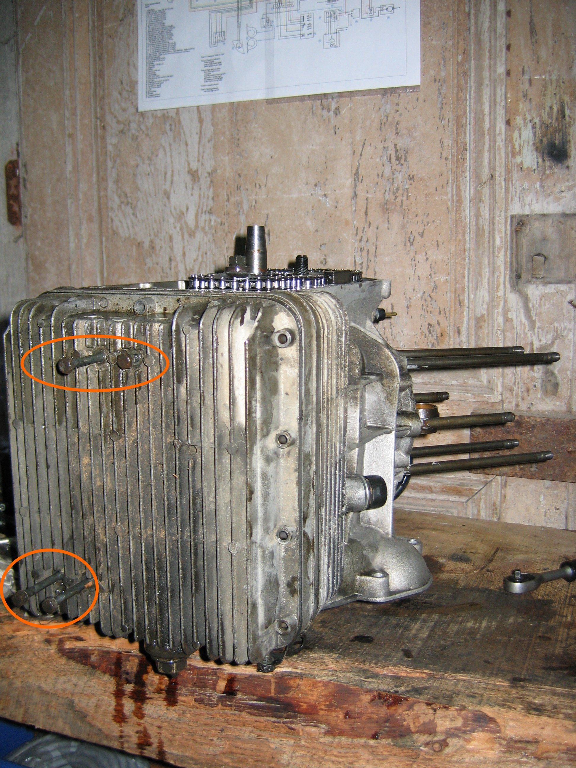 ![]() Carters inférieur et de distributionOn peut alors déposer le carter de distribution. Attention à la taille des vis, trois tailles différentes dans le cas de ce Le Mans.