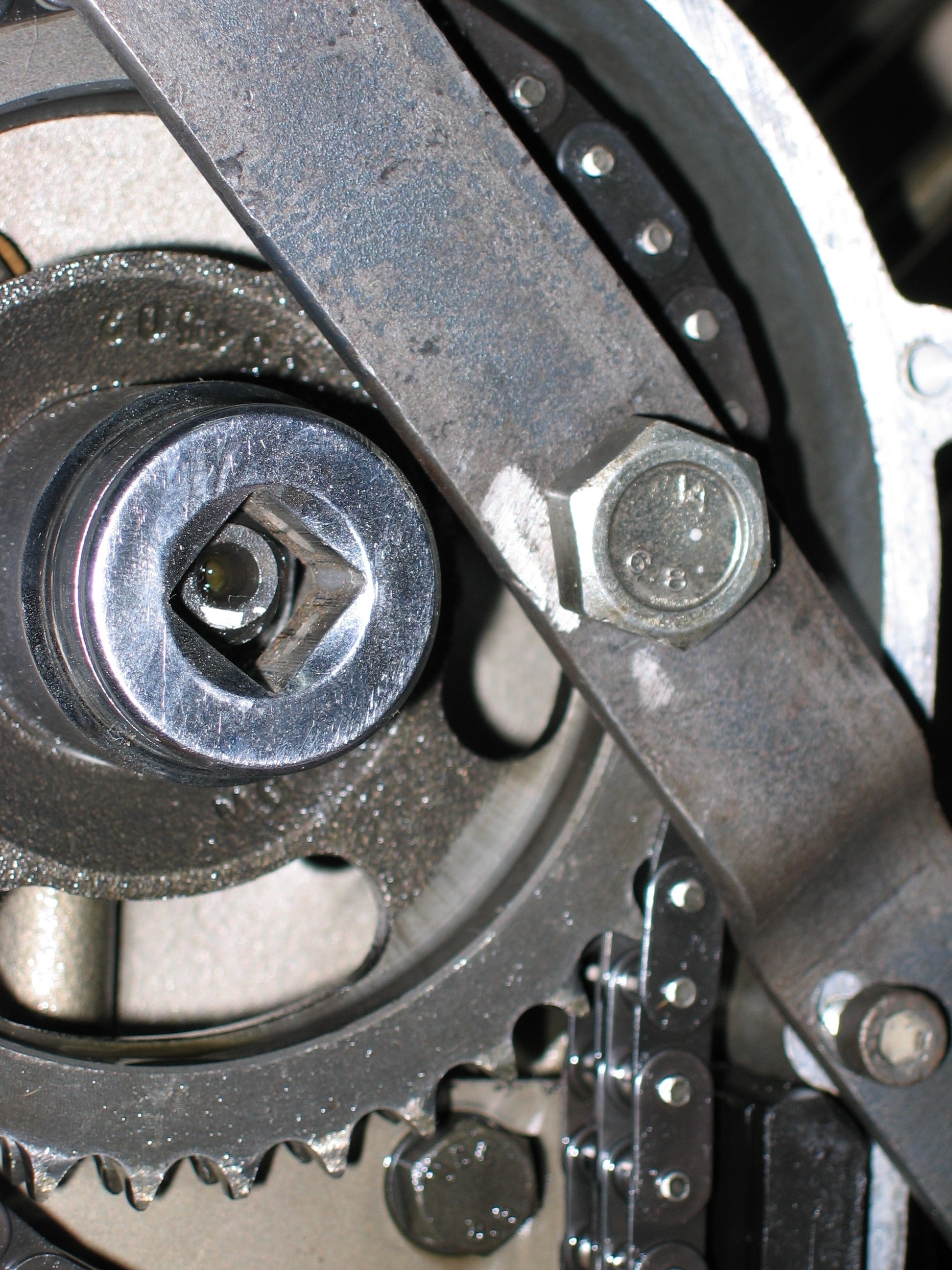 ![]() On essaie maintenant de déposer la distrib. Pour cela, on utilise un outil rustique : un fer tordu, deux trous pour fixer avec les vis du carter de distribution, et un gros boulon qui passe dans un jour de la couronne d'arbre à cames. L'écrou d'arbre à cames est un écrou de 27. l'arbre dépasse franchement, avec le filetage d'entraînement du cable de compte-tours. La douille 27 de chez Facom est assez profonde pour prendre l'écrou et placer le carré. ce n'est pas le cas de toutes les douilles. Il faut bien choquer les écrous pour aider le desserrage, c'est à dire les cogner d'un coup sec avec un marteau (pas un maillet) et un jet. Ca ne suffit pas forcément. Dans mon cas, avec une sangle de maintien du moteur, et un bon bras de levier, j'ai pas réussi, sauf à tordre l'outil de blocage. Avec un autre outil, ça marche. Il s'agit d'une grande barre (bon effet de levier) terminé par un anneau qui passe autour de la douille de 27, avec 2 tiges qui passent dans les jours de la couronne d'arbre à cames.