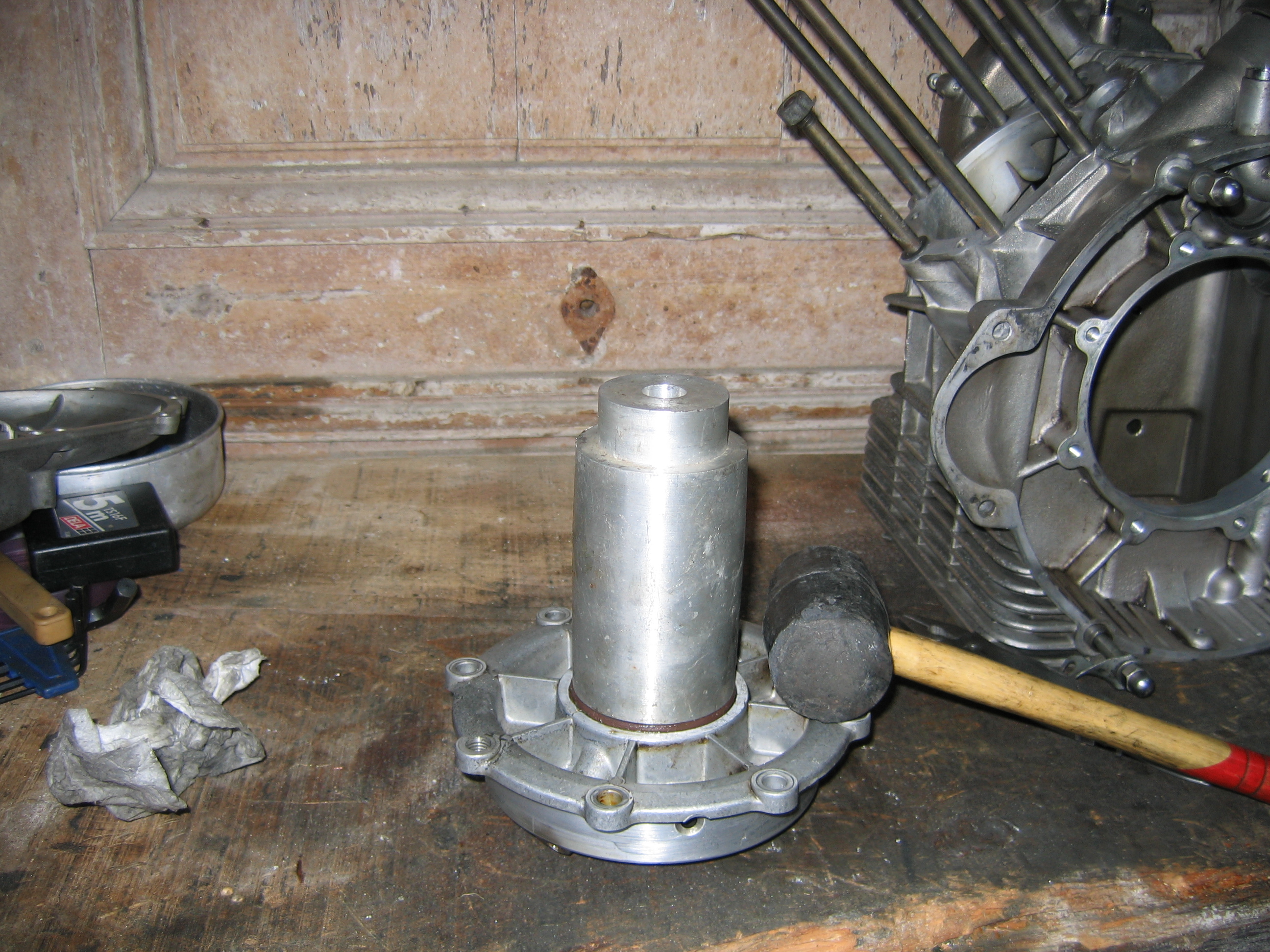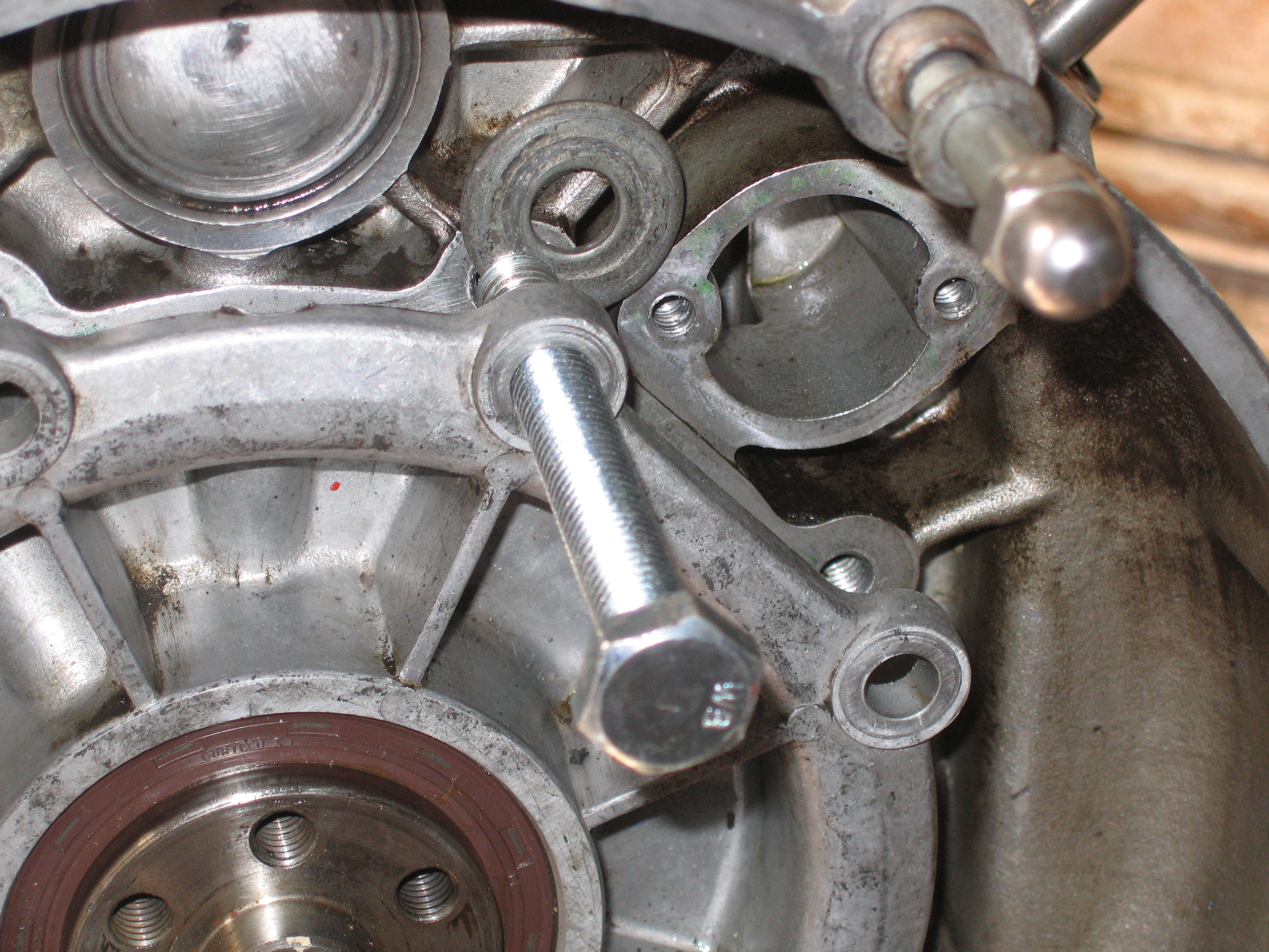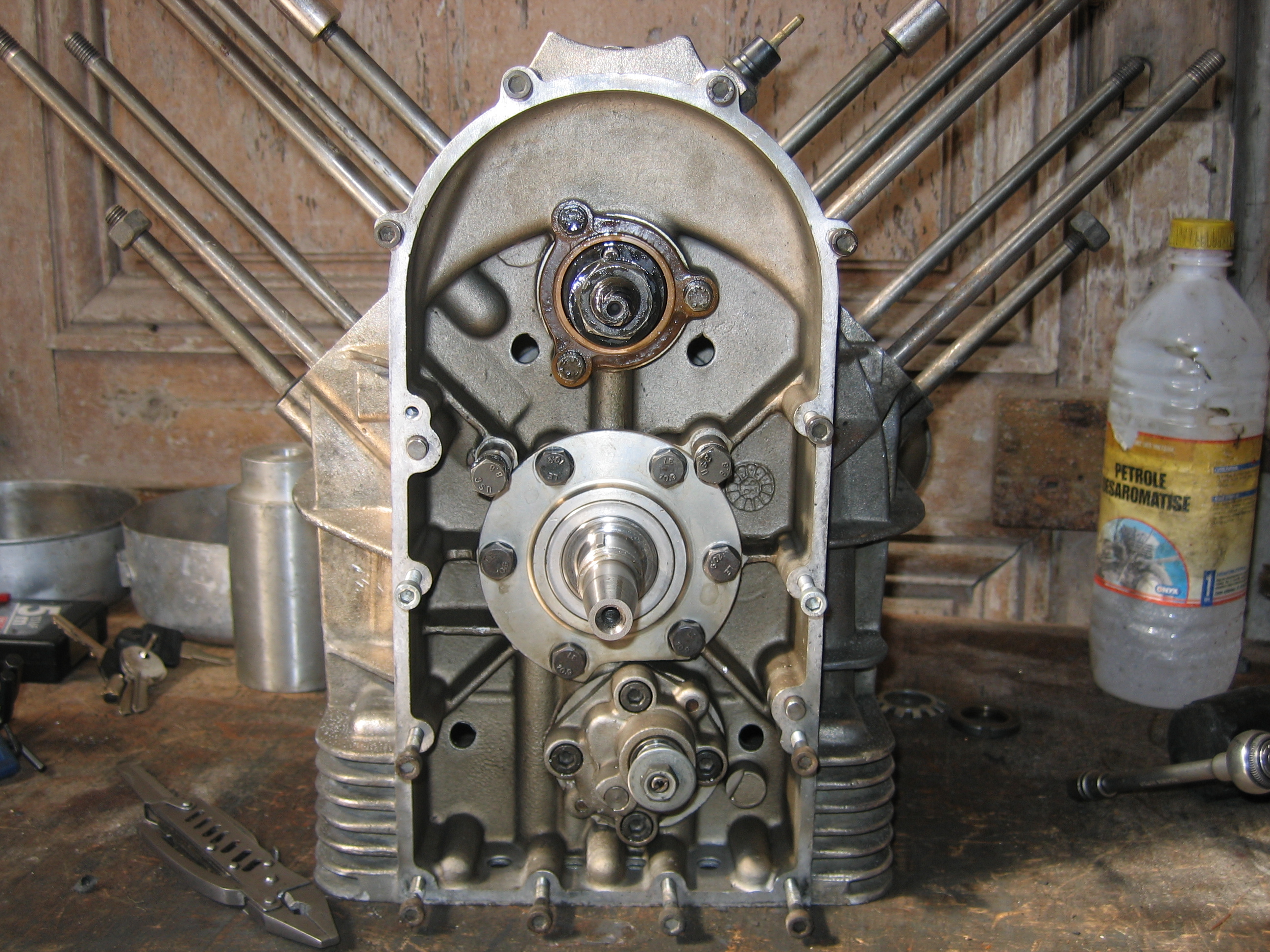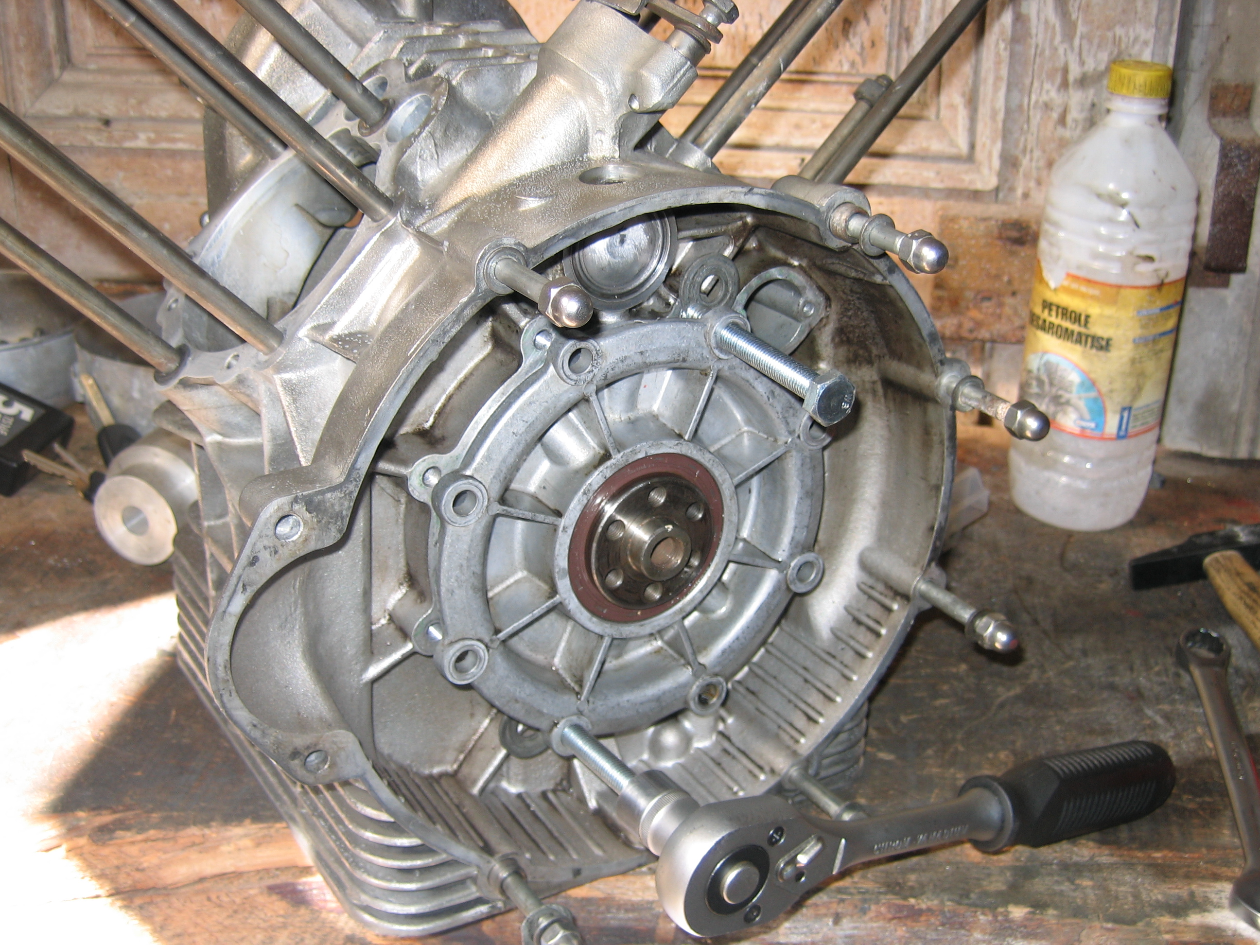 ![]() ![]() confirmer le type de rondelles (frein pour les vis d'embrayage, volant et palier AR, plates pour le palier AV). Palier arrièreFaire tremper au WD40 ne peut pas nuire. Ce palier est fixé par 8 vis en diamètre 8. Il y a donc des trous dans le palier, et des filetage en diamètre 8 dans le carter moteur. A cela s'ajoute en deux trous diamètralement opposés du palier des filetage plus gros, diamètre 10. Ils n'empèche pas la vis de 8 de passer au travers pour tenir le palier, mais ils permettent de visser dans le palier deux vis de 10 pour appuyer sur le carter. Visser les vis jusqu'au contact, puis les serrer par quart de tour, l'une après l'autre, sans forcer trop, en tapotant par l'autre coté avec un jet en cuivre, ou puisque le palier avant est déposé, directement au maillet sur le vilo coté avant. On met en tension, on tape et on recommence... Il ne faut pas mettre le palier en travers et le bloquer.Attention aussi, parfois les vis attaquent le carter et défonce le début de filet, peut être voir à bien nettoyer les vis à la lime ;) une fois le carter décollé il est bien de placer une rondelle pour servir d'appui plus large.