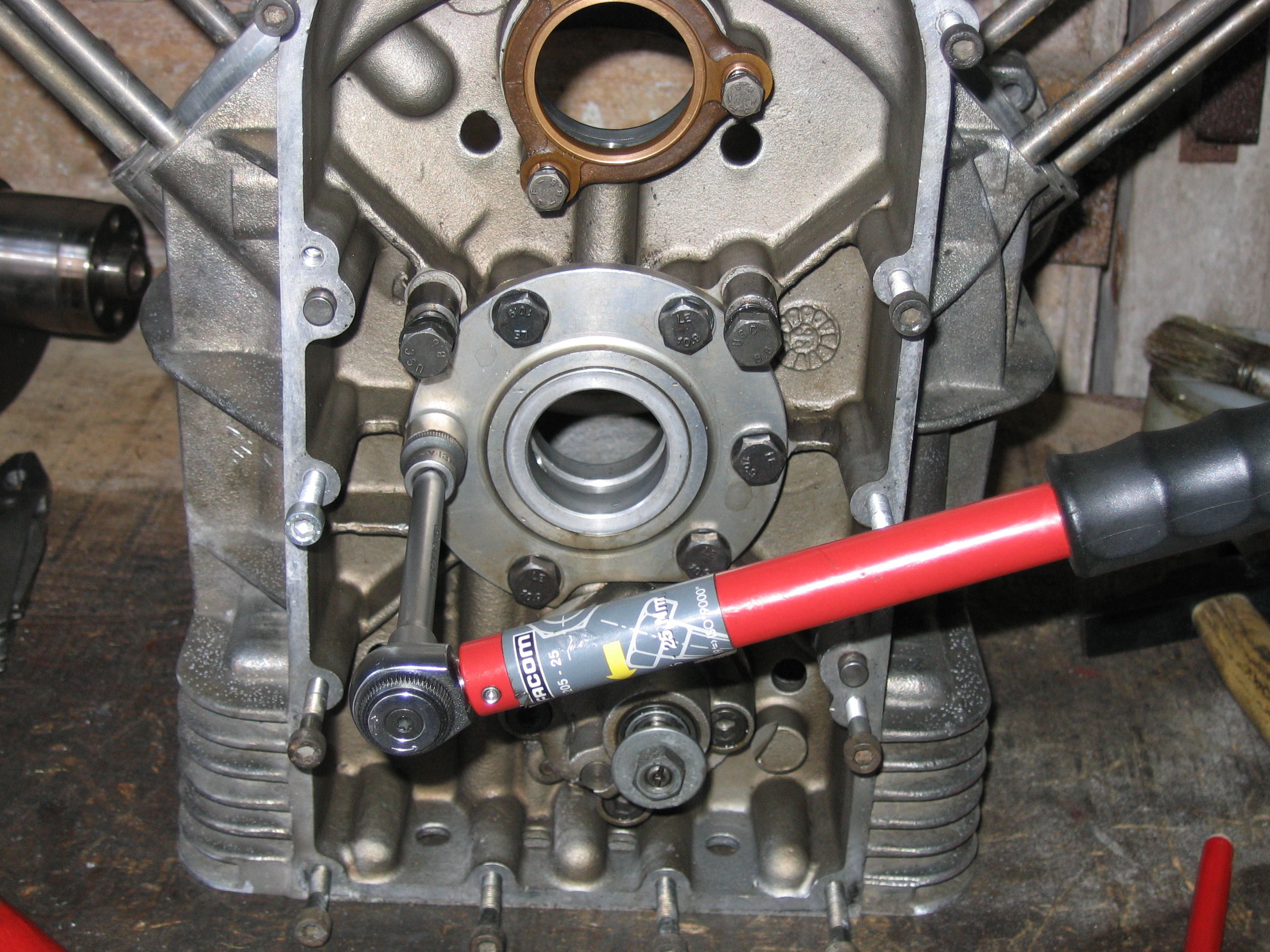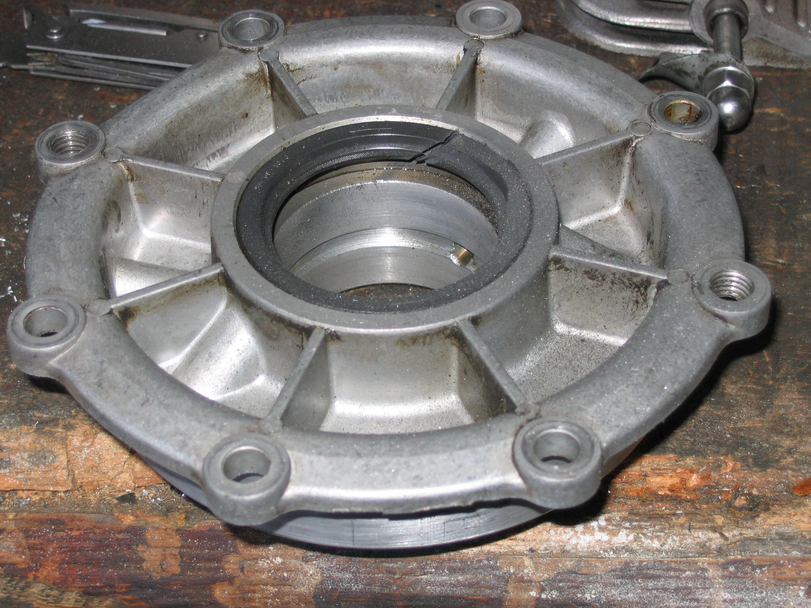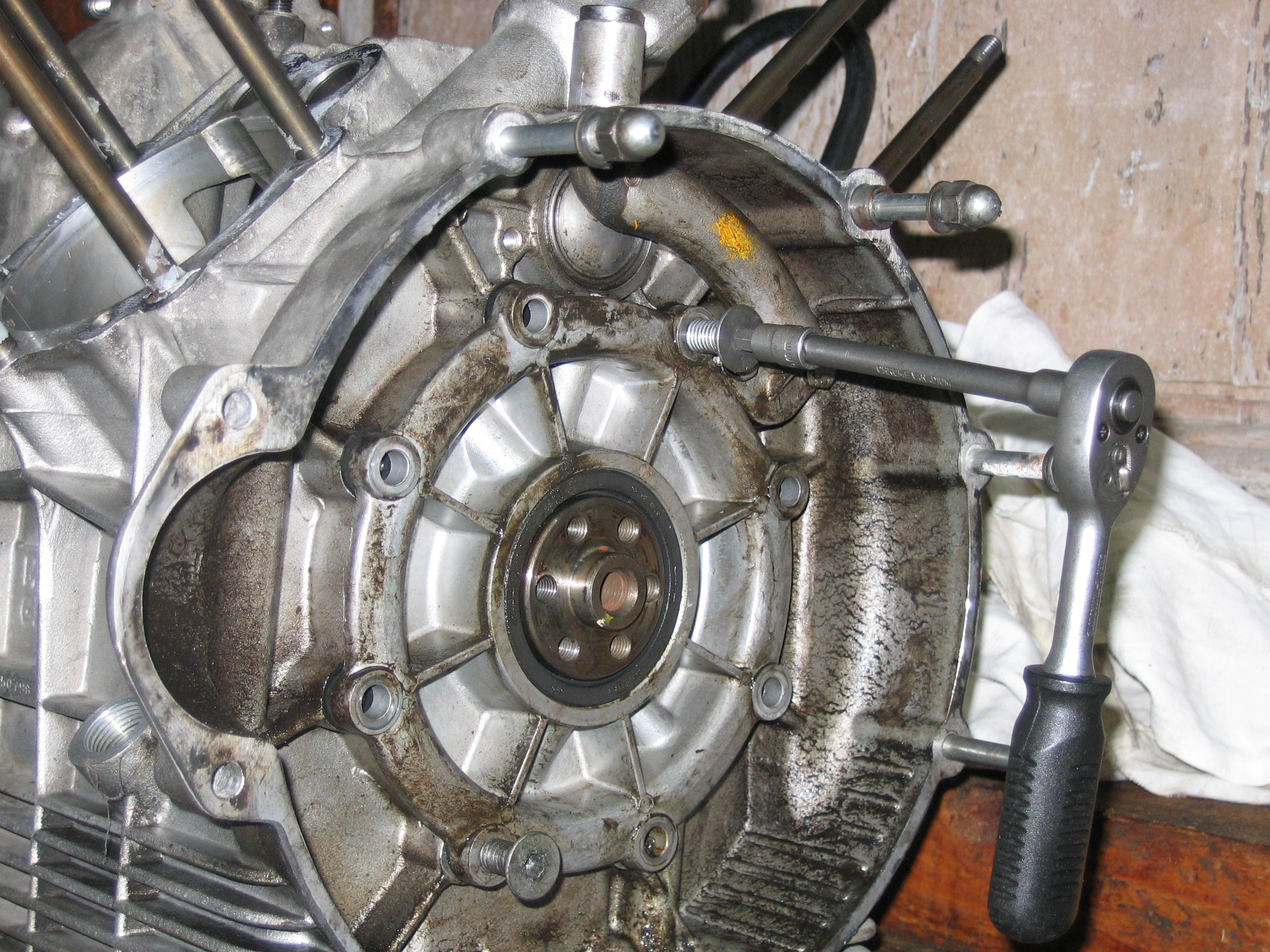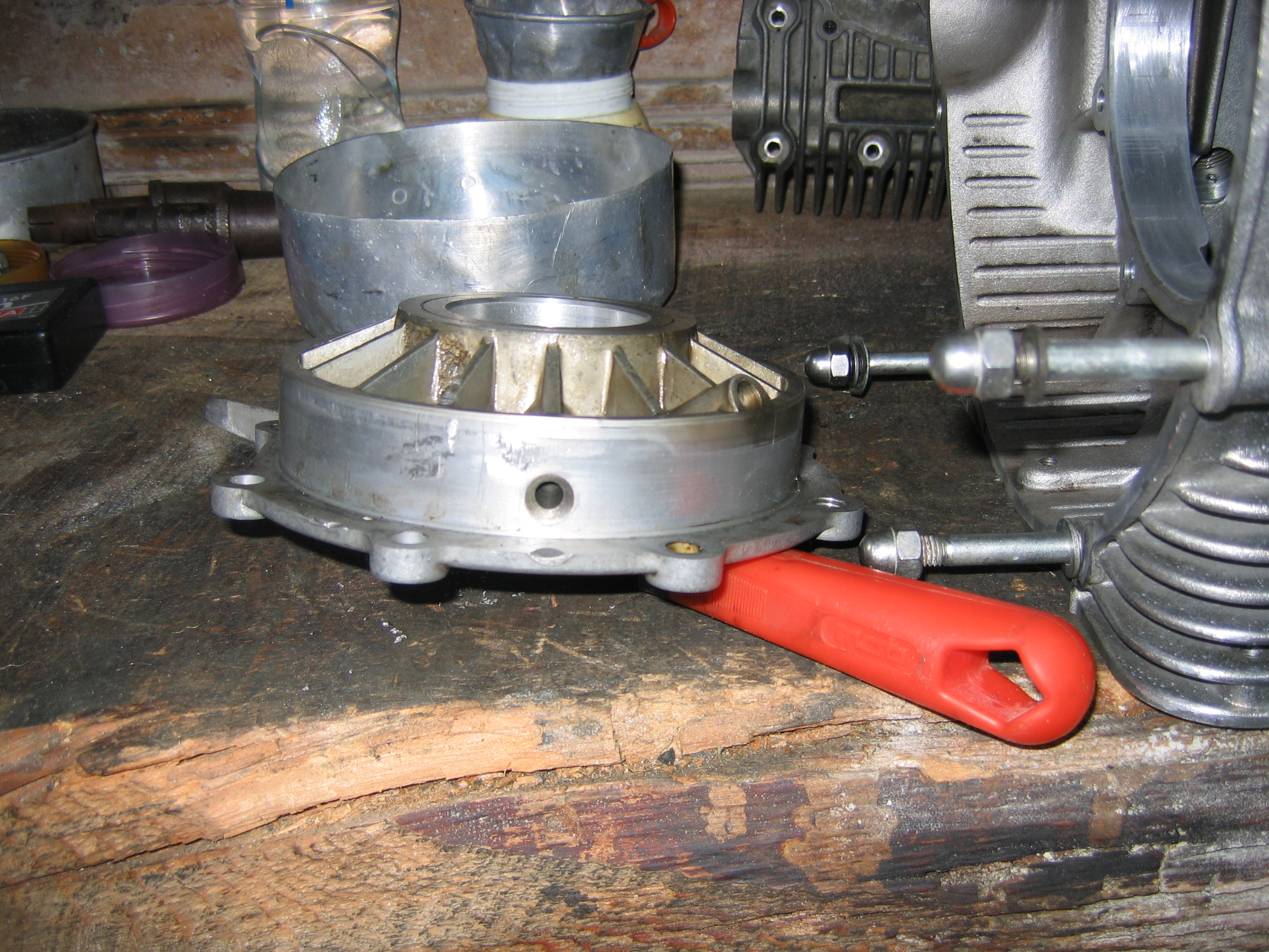 ![]() ![]() confirmer le type de rondelles (frein pour les vis d'embrayage, volant et palier AR, plates pour le palier AV). Palier arrièreFaire tremper au WD40 ne peut pas nuire. Ce palier est fixé par 8 vis en diamètre 8. Il y a donc des trous dans le palier, et des filetage en diamètre 8 dans le carter moteur. A cela s'ajoute en deux trous diamètralement opposés du palier des filetage plus gros, diamètre 10. Ils n'empèche pas la vis de 8 de passer au travers pour tenir le palier, mais ils permettent de visser dans le palier deux vis de 10 pour appuyer sur le carter. Visser les vis jusqu'au contact, puis les serrer par quart de tour, l'une après l'autre, sans forcer trop, en tapotant par l'autre coté avec un jet en cuivre, ou puisque le palier avant est déposé, directement au maillet sur le vilo coté avant. On met en tension, on tape et on recommence... Il ne faut pas mettre le palier en travers et le bloquer.Attention aussi, parfois les vis attaquent le carter et défonce le début de filet, peut être voir à bien nettoyer les vis à la lime ;) une fois le carter décollé il est bien de placer une rondelle pour servir d'appui plus large.