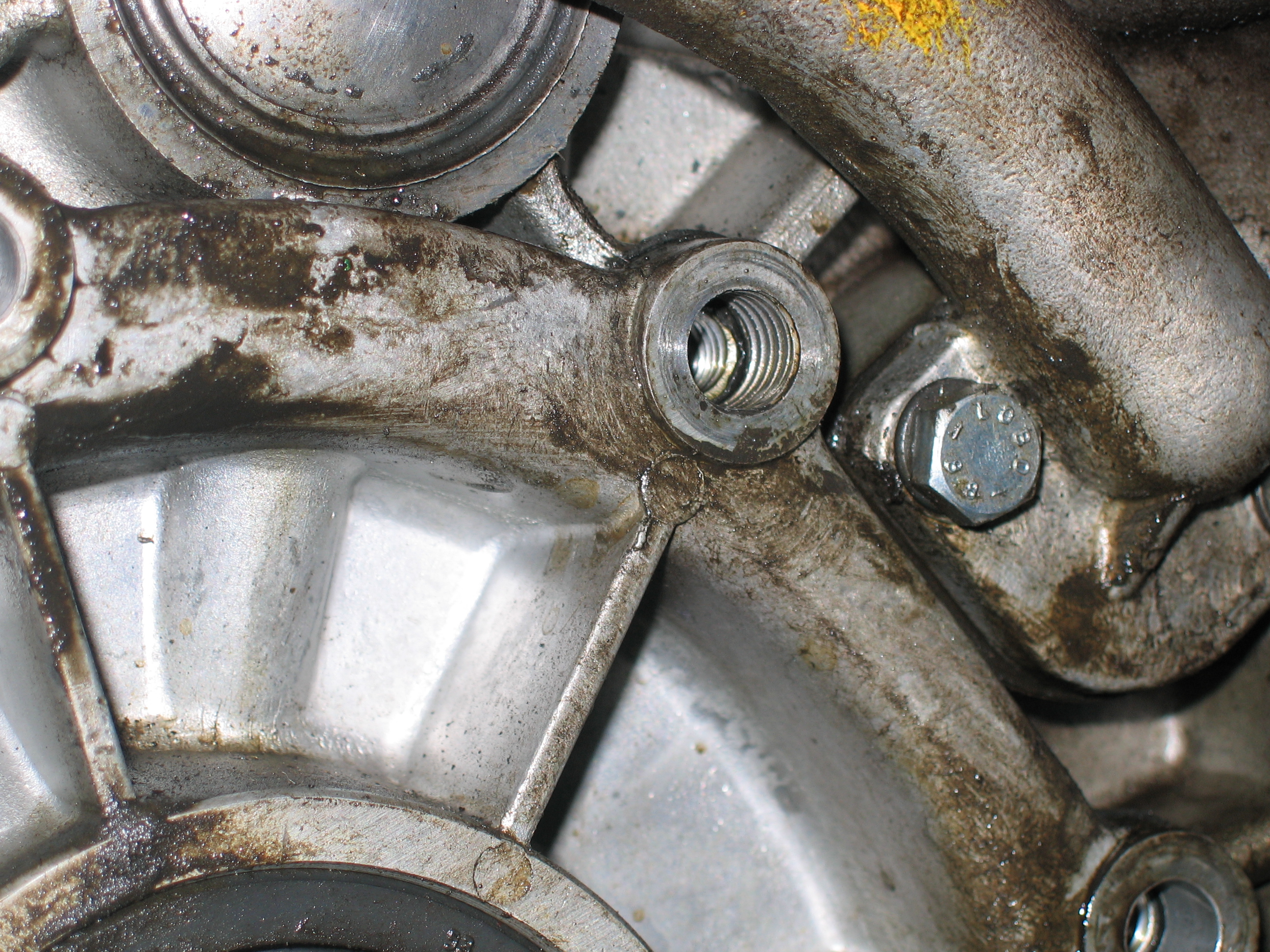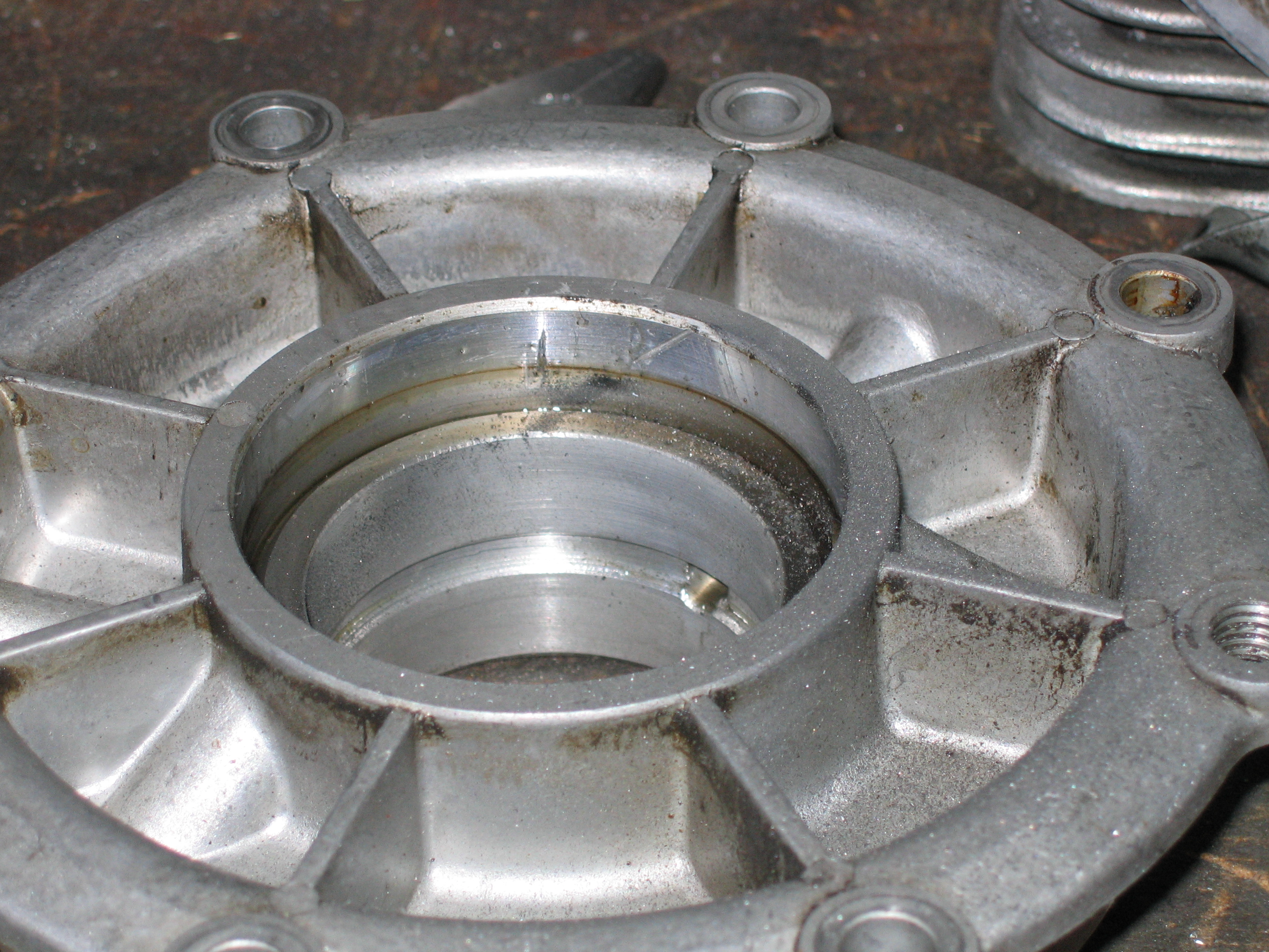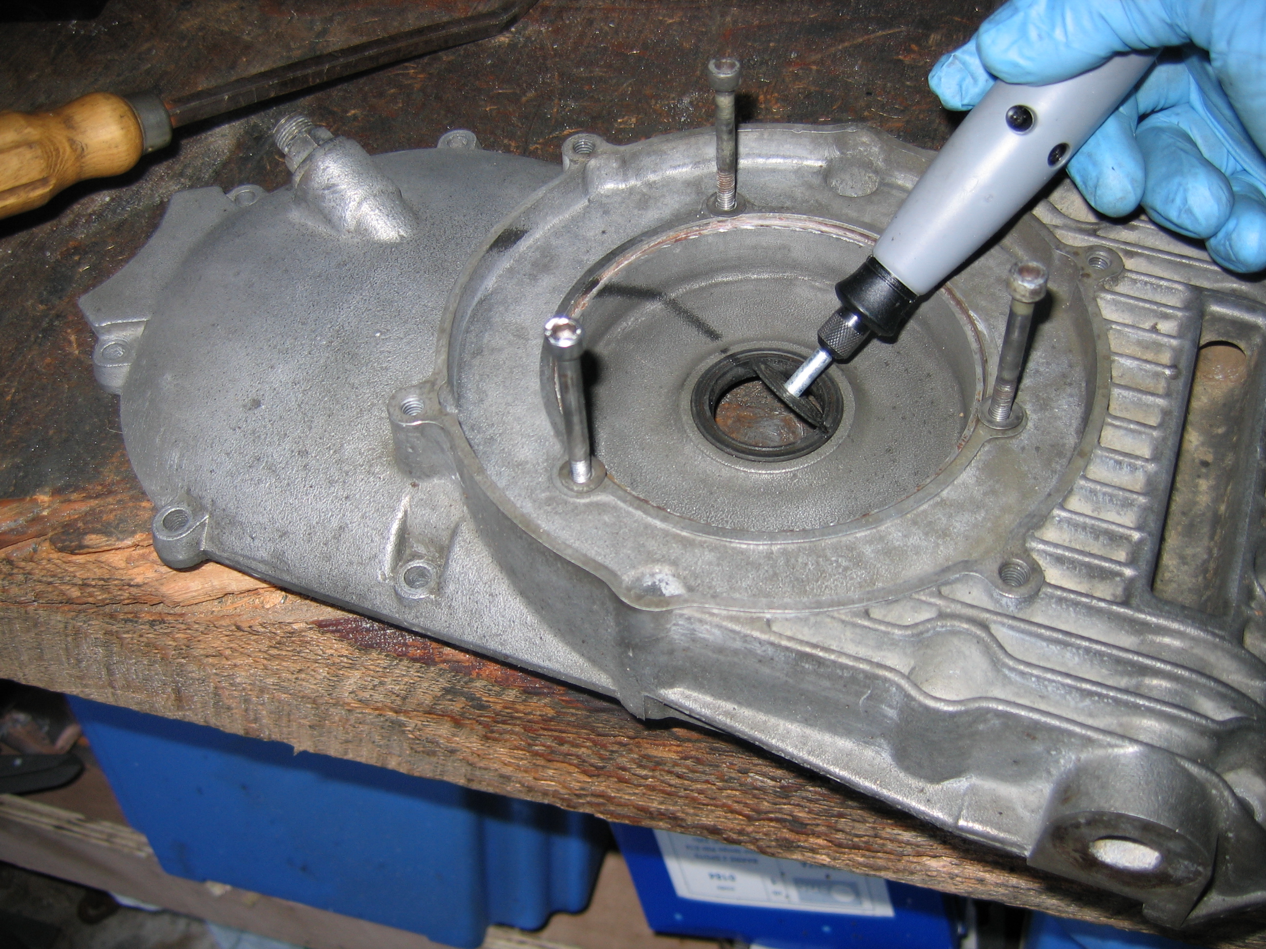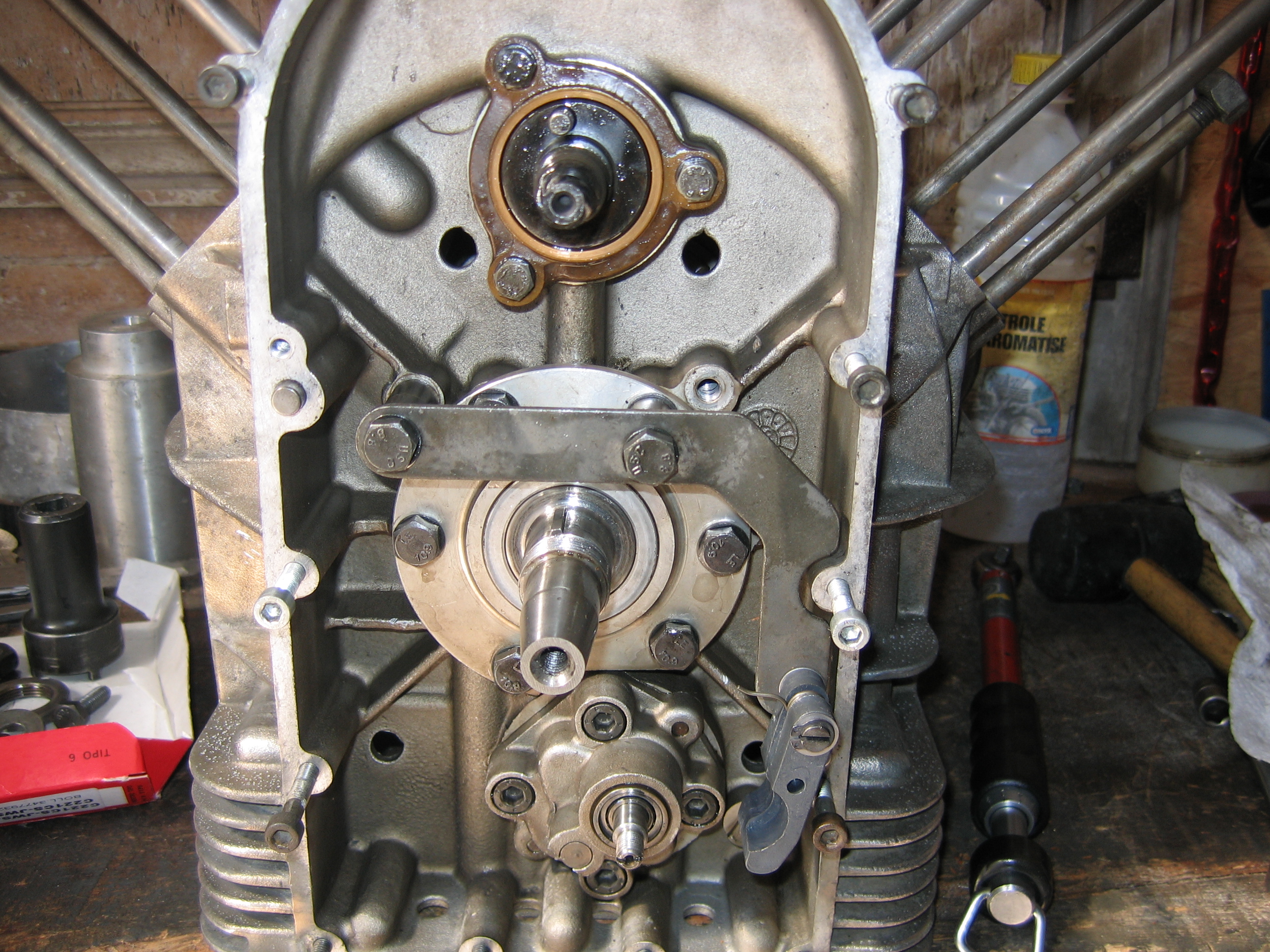 ![]() ![]() confirmer le type de rondelles (frein pour les vis d'embrayage, volant et palier AR, plates pour le palier AV). Palier arrièreFaire tremper au WD40 ne peut pas nuire. Ce palier est fixé par 8 vis en diamètre 8. Il y a donc des trous dans le palier, et des filetage en diamètre 8 dans le carter moteur. A cela s'ajoute en deux trous diamètralement opposés du palier des filetage plus gros, diamètre 10. Ils n'empèche pas la vis de 8 de passer au travers pour tenir le palier, mais ils permettent de visser dans le palier deux vis de 10 pour appuyer sur le carter. Visser les vis jusqu'au contact, puis les serrer par quart de tour, l'une après l'autre, sans forcer trop, en tapotant par l'autre coté avec un jet en cuivre, ou puisque le palier avant est déposé, directement au maillet sur le vilo coté avant. On met en tension, on tape et on recommence... Il ne faut pas mettre le palier en travers et le bloquer.Attention aussi, parfois les vis attaquent le carter et défonce le début de filet, peut être voir à bien nettoyer les vis à la lime ;) une fois le carter décollé il est bien de placer une rondelle pour servir d'appui plus large.